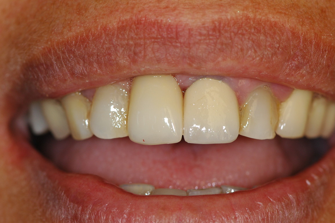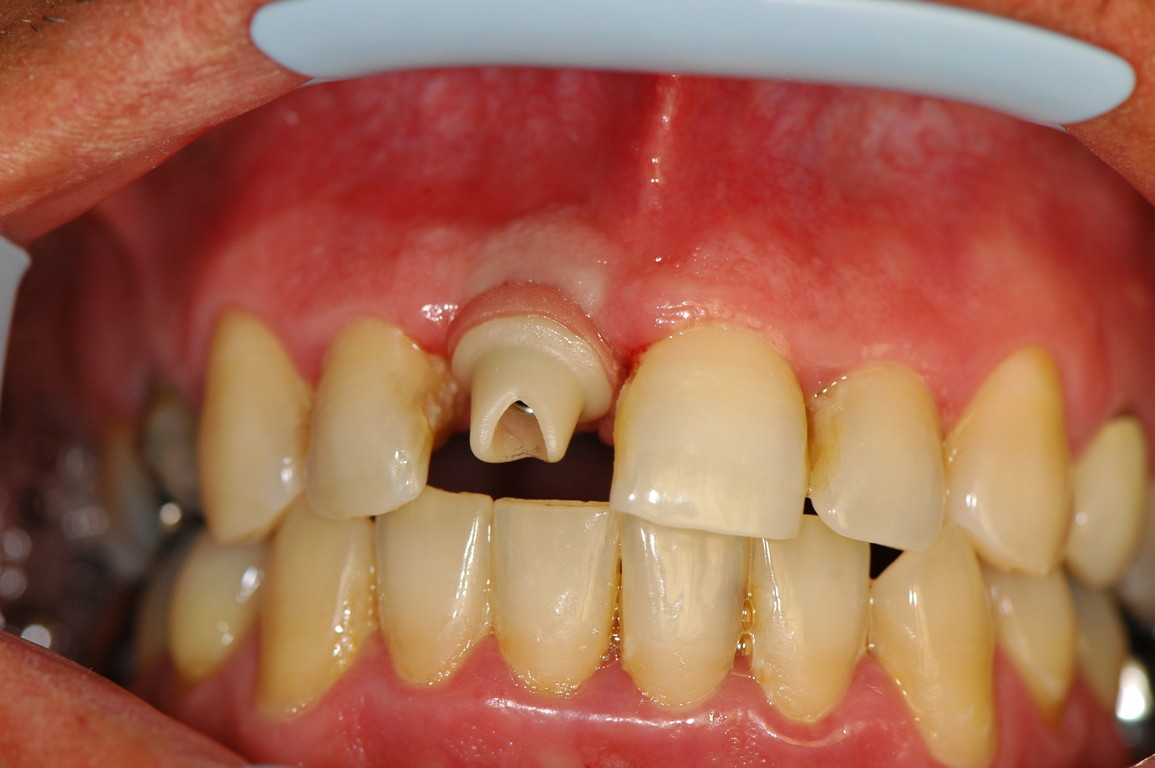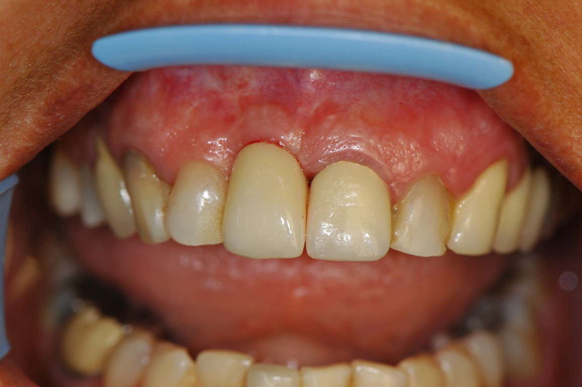 Noter la différence de longueure des incisives centrales a la perte osseuse . Le pilier zircone avec fausse gencive céramisée permet de suprimer ce problème