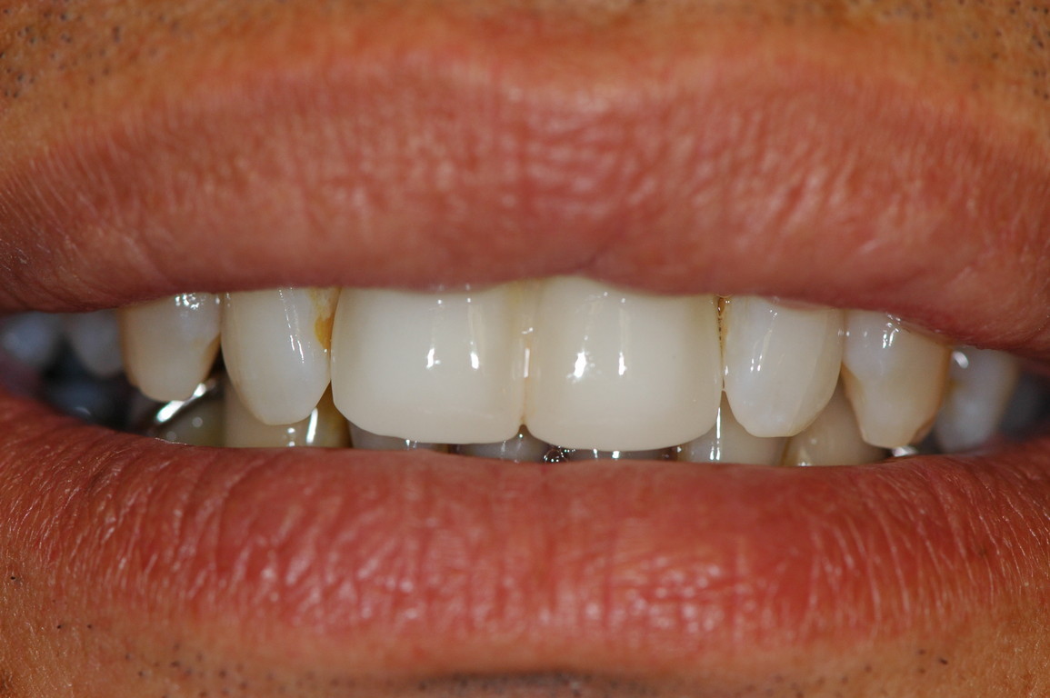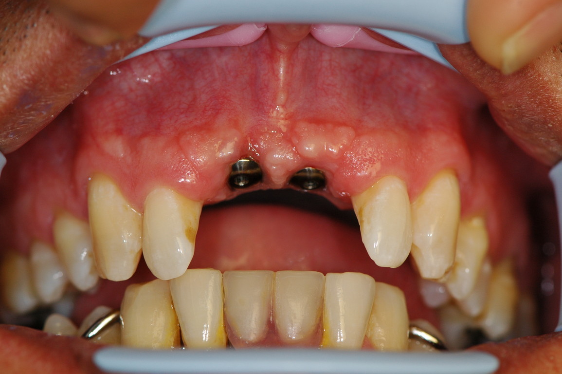 Patient n'ayant pas souhaité de greffe osseuse . Une fausse gencive zircone a été utilisée afin que ces deux incisives centrales ne paraissent pas trop longues dans son sourire et restent en harmonie avec les autre dents . Le tout sans douleur postopératoire selon le désir du patient ( une greffe osseuse lui aurait imposé des suites opératoires plus lourdes que la simple pose d'implants )